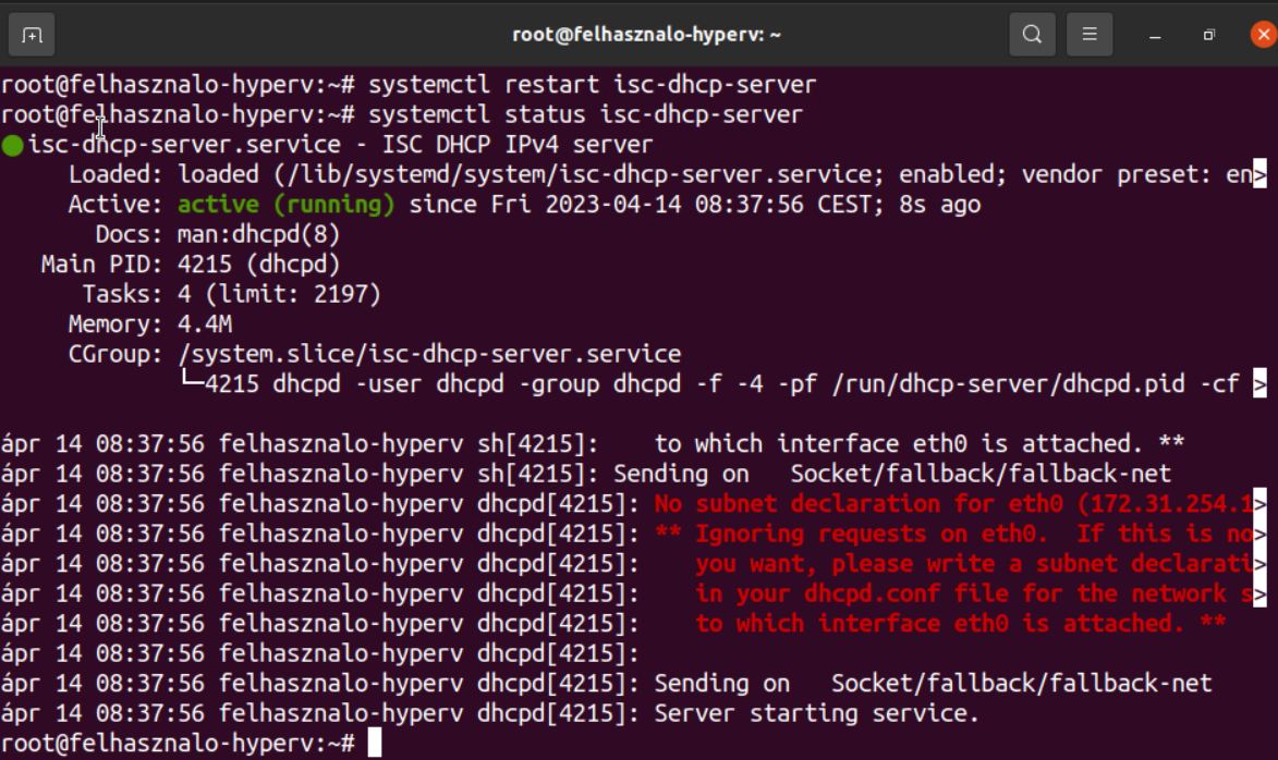 Ezután indítsuk újra a DHCP szolgáltatást systemctl restart isc-dhcp-server paranccsal! Majd ellenőrizzük az állapotát!