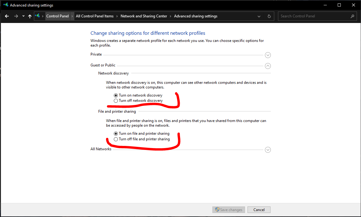 Vezérlőpult - Hálózati és megosztási központ - Speciális megosztási beállításokon belül, a Vendég vagy Nyilvános hálózatok, valamint a Privát hálózatok számára engedélyezzük a fájlmegosztást!