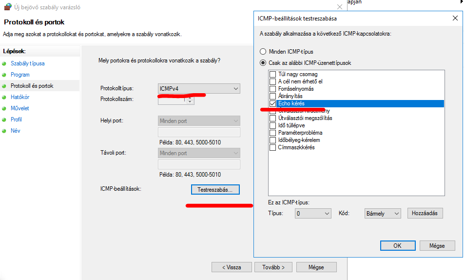 Protokolltípus: ICMPv4 - testreszabáson belül - CSAK echo kérés.