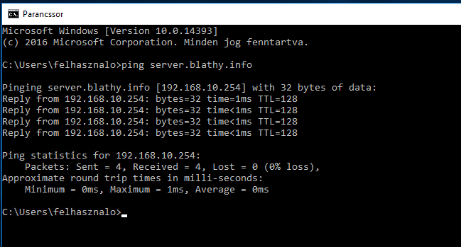 Tesztelés: kliensen megpingeljük a megfelelő domain nevet.